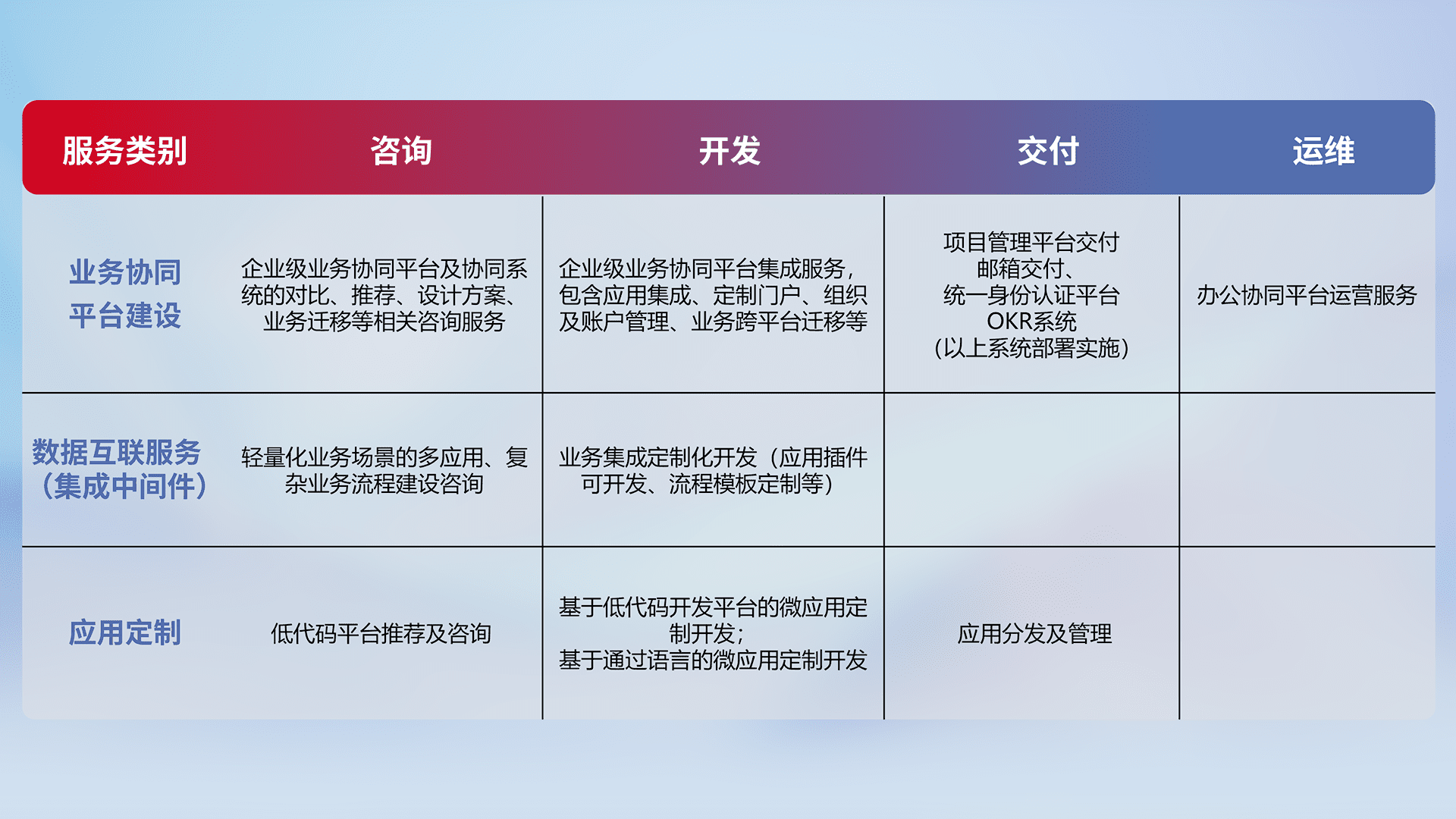 针对钉钉、、企微、、、IDaas等平台级产品提供产品的规划、、方案、、、交付、、、、定制化开发等服务,,实现如统一协同办公、、、智能客户服务、、、混合会议管理、、、智能数据查询、、、等业务场景,,实现数字化转型。。。